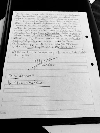 “Hola, soy Martín Santiago del Rio. Lo primero que quiero decir es que soy inocente. Me mataron a mis padres. Amé, amo y amaré toda mi vida a mis padres, Quique y Mecha. Fueron las personas que me criaron, me cuidaron siempre en las buenas y en las malas”.